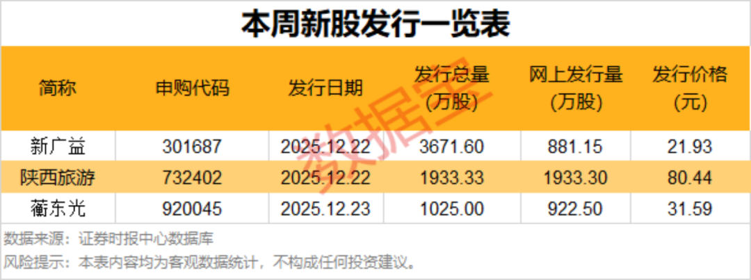根据发行安排,本周暂有3只新股申购,本周一(12月22日)可申购新广益、陕西旅游,本周二可申购蘅东光。
